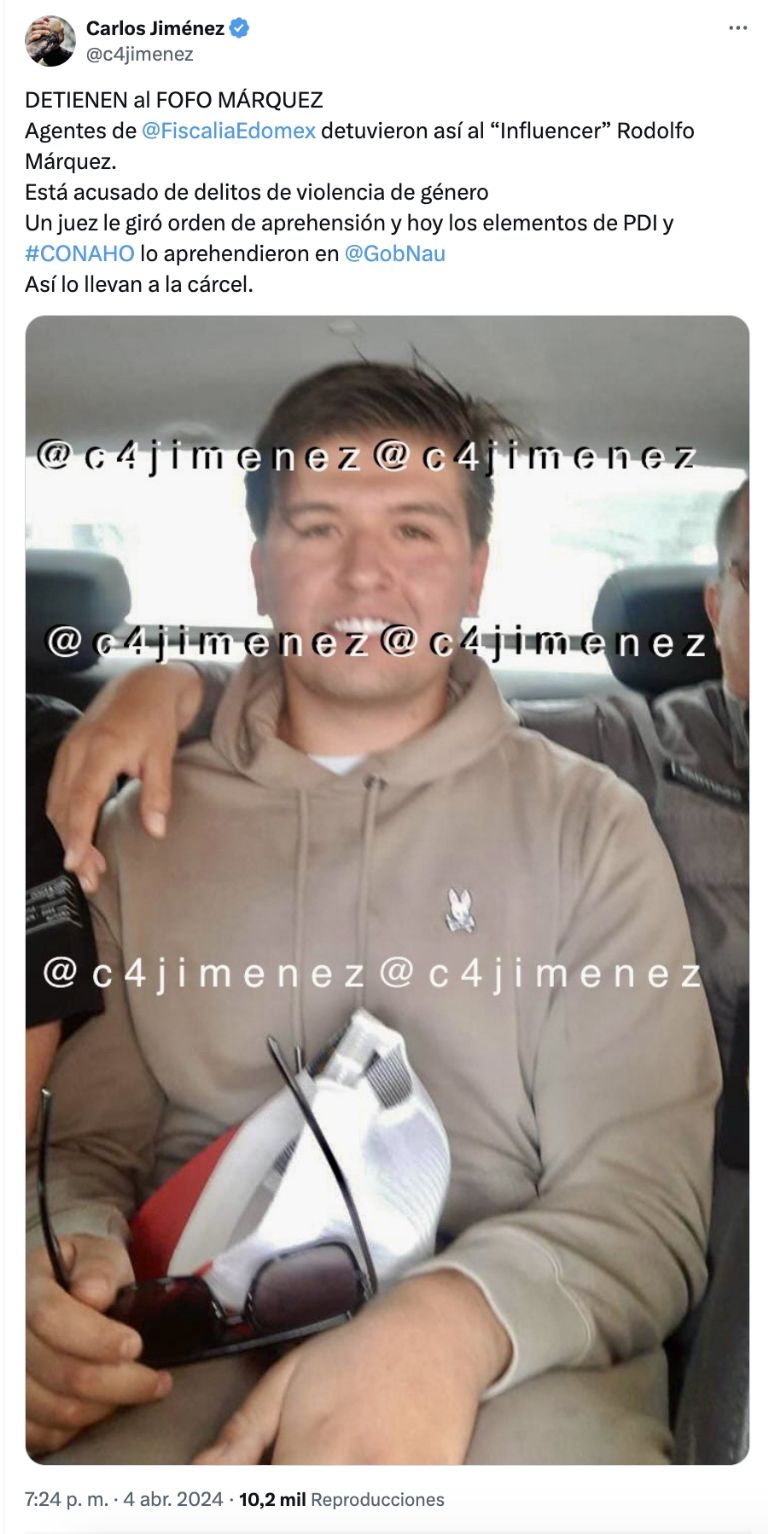 El influencer Fofo Márquez ha sido detenido despues de golpear a una mujer en el Estado de México, tras tener un percance automovilistico. Apesar de que diversas personas intentaron defender a la mujer, el influencer escapo de la escena en su camioneta luego de pelear con un hombre, pero no pudo escpaar de la justicia, pues seria detenido por agresión en Naucalpan, Estado de México.