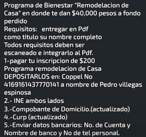La coordinación regional de Bienestar en Coatzacoalcos, alertó a los beneficiarios delprograma “Vivienda para el Bienestar”, a no dejarse engañar por un presunto fraude, en donde les están solicitando 200 pesos para inscribirse.