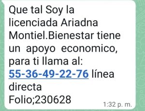 También, informó que a nombre de la secretaria del Bienestar, Ariadna Montiel Reyes, les están enviando mensajes vía WhatsApp en el que les dicen que son acreedores a un apoyo económico, aportan un número telefónico y de folio para comunicarse.
