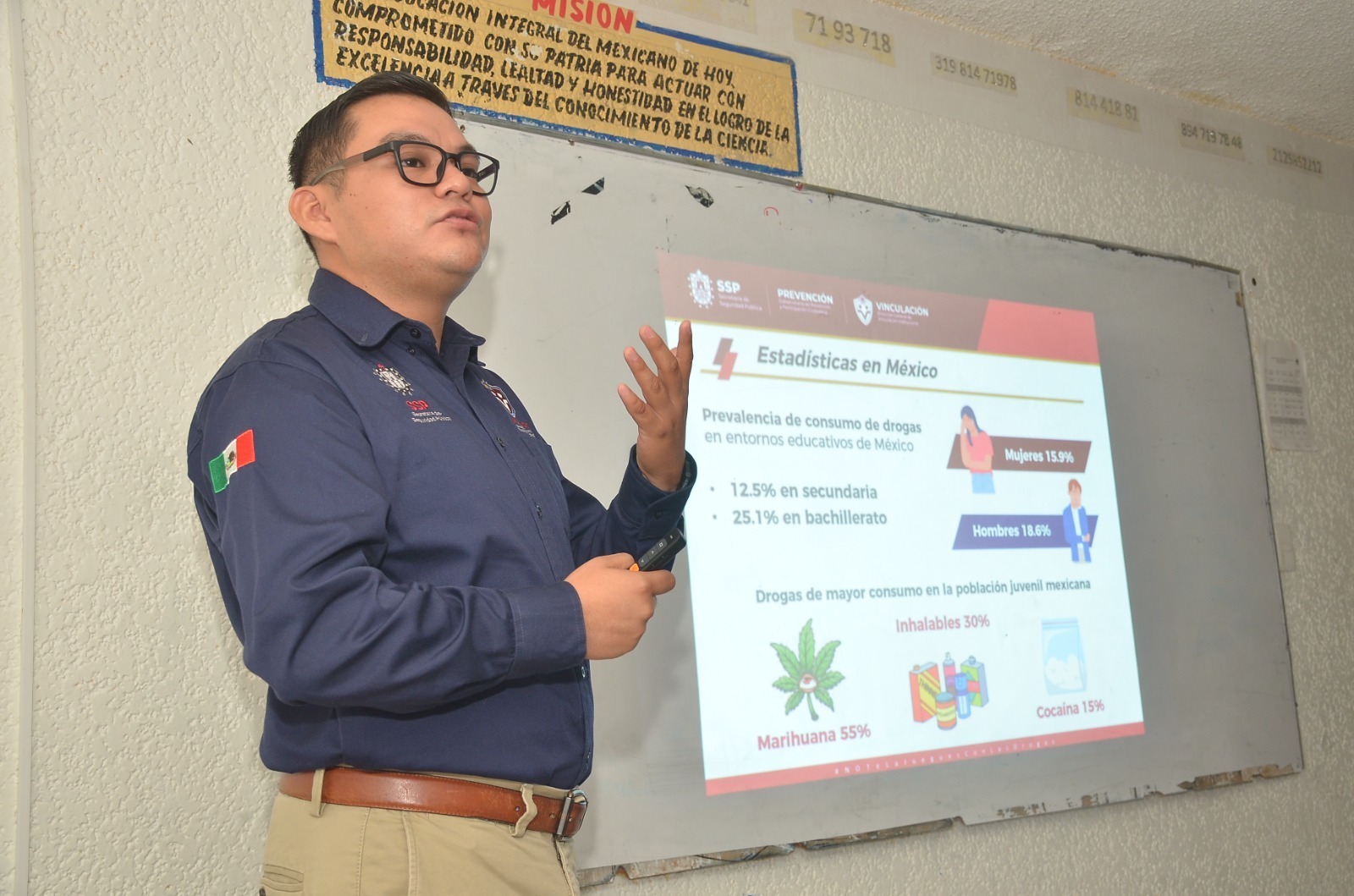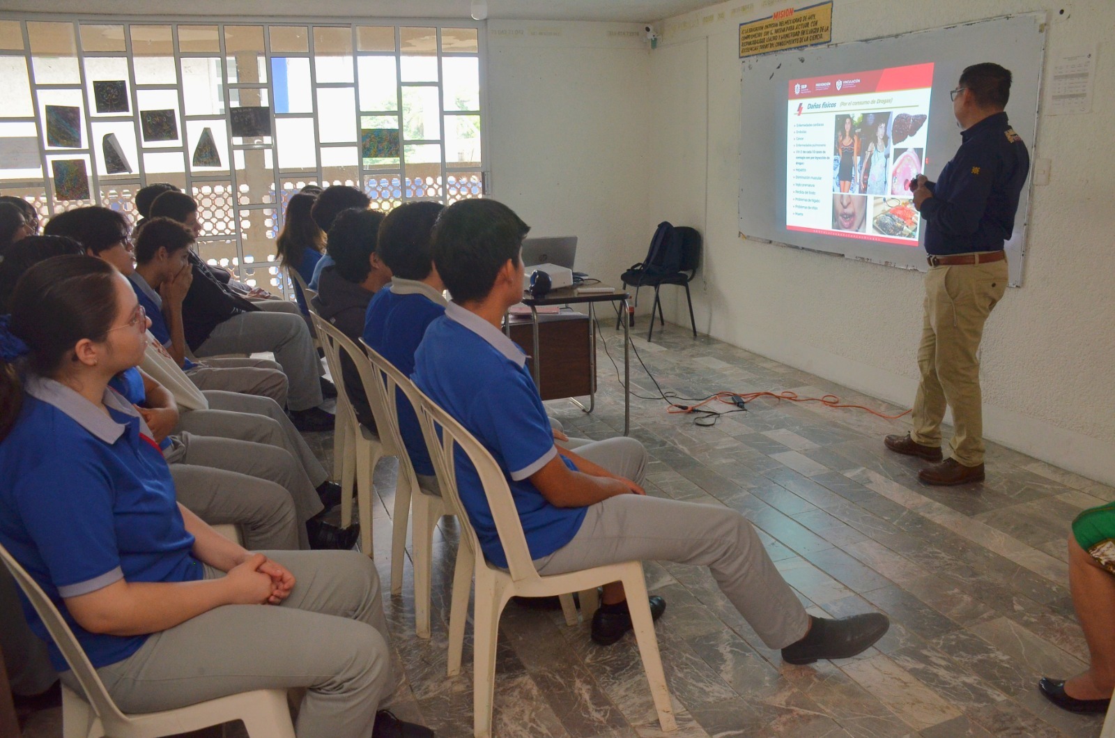 Con la finalidad de prevenir el consumo de sustancias adictivas entre jóvenes de Coatzacoalcos y concientizarlos acerca de sus peligros y consecuencias, se ofreció la plática ¡No te la juegues con las drogas! a un total de 70 alumnos del Bachillerato Tecnológico John J. Spark.