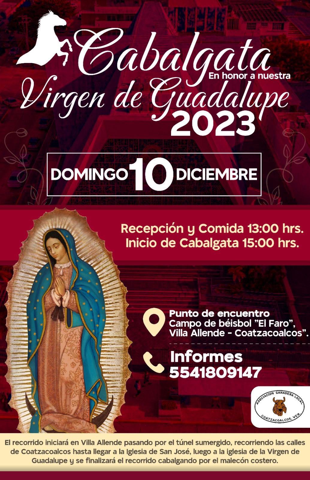 En este 2023 la cabalgata será el 10 de diciembre a la una de la tarde, partiendo del campo de béisbol “El Faro”, en Villa Allende para continuar el recorrido por el túnel sumergido hasta llegar a la iglesia San José, de ahí el Santuario de Guadalupe y terminar cabalgando por el malecón al hemiciclo a los niños héroes.