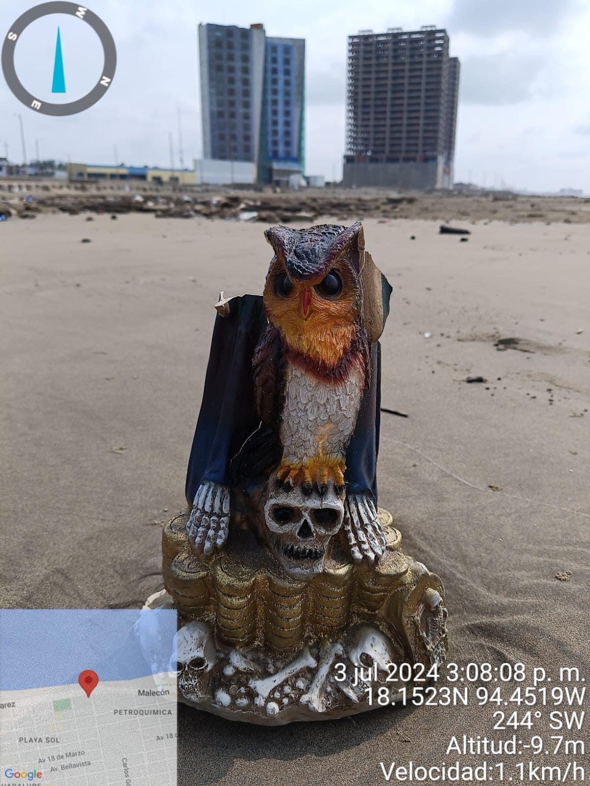 Una efigie relacionada con cultos a la muerte y santería fue encontrada en las playas de Coatzacoalcos, a la altura de Playa Sol, el día de hoy mientras funcionarios estatales realizaban una inspección sobre la costa por la aparición de hidrocarburo.