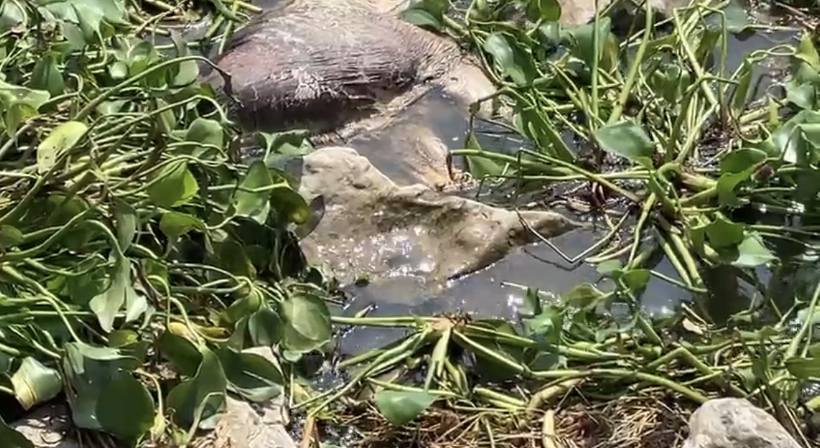 Y es que desde hace varios días la corriente generado por las lluvias, han traído gran cantidad de lirio acuático, por lo que se cree que dentro de la palotada y el pantano llegó el animal.