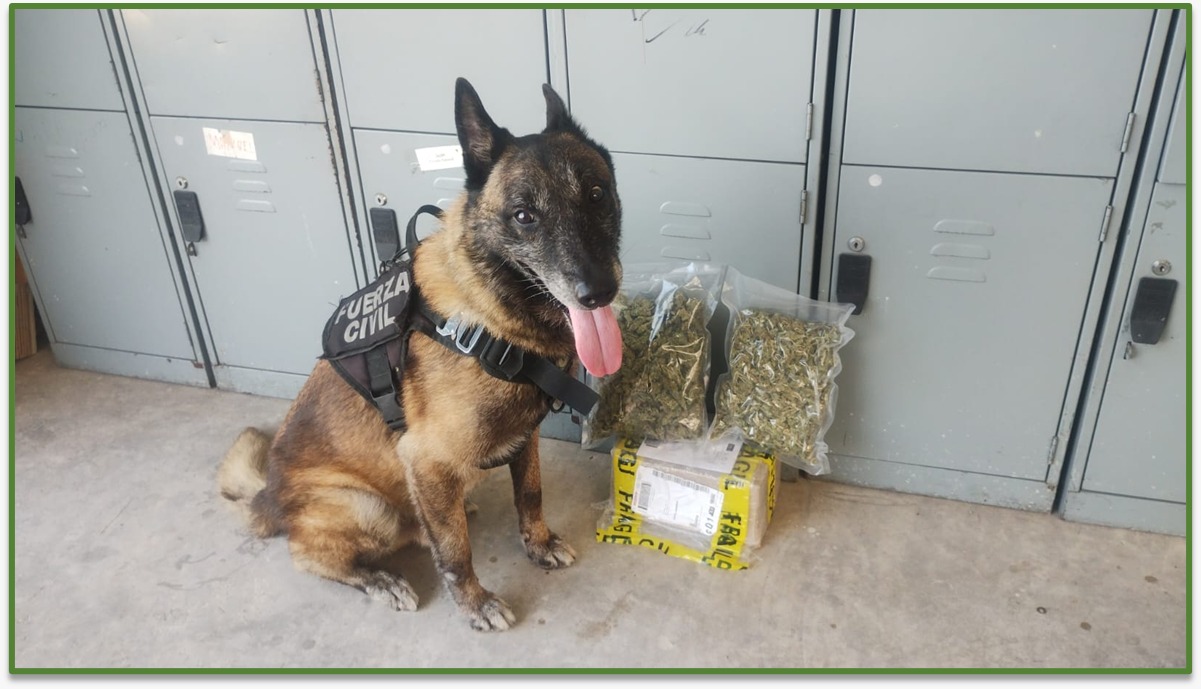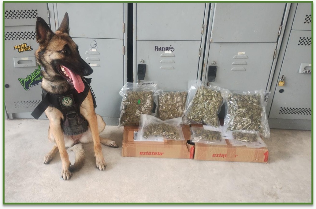 Durante el mes de agosto efectivos de la Secretaría de Seguridad Pública (SSP), a través de la Compañía K9 de Fuerza Civil han realizado distintos operativos en negocios dedicados al envío de paquetería, asegurando hasta el momento 18 kilos 361 gramos de hierba verde con características similares a la marihuana, además de otros estupefacientes.