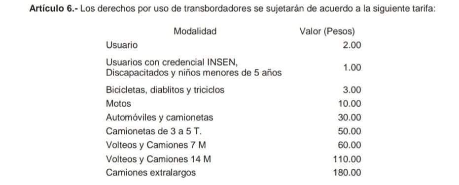 Se registrará un aumento de un peso a dos pesos para los usuarios, mientras que las personas de la tercera edad con credencial del INSEN, discapacitados o niños menores de cinco años, el costo del boleto será de un peso, cuando anteriormente era gratuito el cruce por el rio Coatzacoalcos.