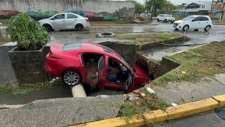 Un automóvil cayó dentro del canal pluvial que atraviesa la avenida Jirafas, ubicada al poniente de la ciudad de Coatzacoalcos.
