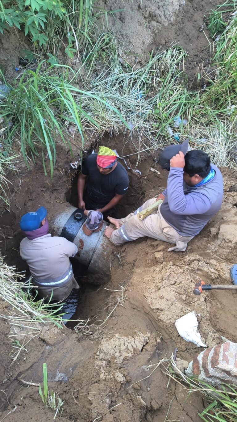 Personal operativo de CMAS trabaja en la colocación de la primera abrazadera en la línea de 18 pulgadas, paso fundamental para continuar con la instalación de la válvula de succión de aire.