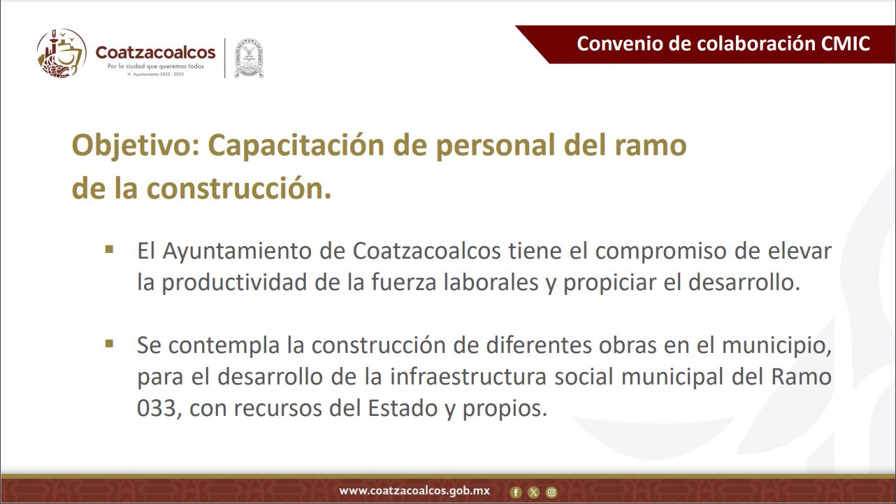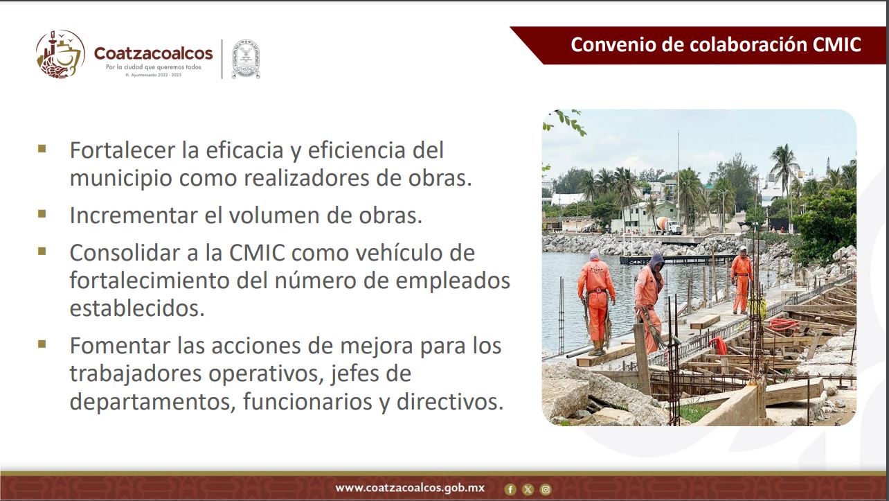 El Ayuntamiento informará mensualmente a la Cámara e Instituto sobre las retenciones, con fines de transparencia. Con estas acciones se busca fortalecer a los trabajadores operativos, jefes de departamentos, funcionarios y directivos, en materia de obra pública.