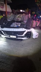 Por el Fuerte impacto del choque, el vehículo MG, quedó volcado con las llantas hacia arriba.