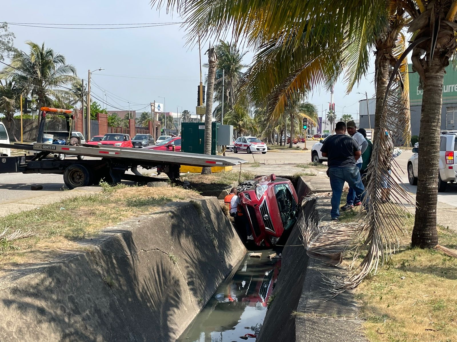 Una dama que conducía un automóvil Nissan tipo Versa color rojo, cayó en el canal de aguas negras de la avenida Las Palmas en la zona poniente de Coatzacoalcos.
