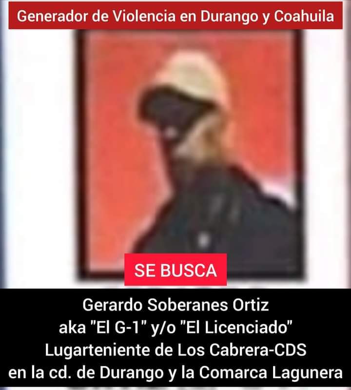 De acuerdo con reportes oficiales, Gerardo Soberanes Ortiz, alias “El G1” o “El Licenciado” operaba las actividades delictivas en el municipio de Durango y en la Comarca Lagunera.