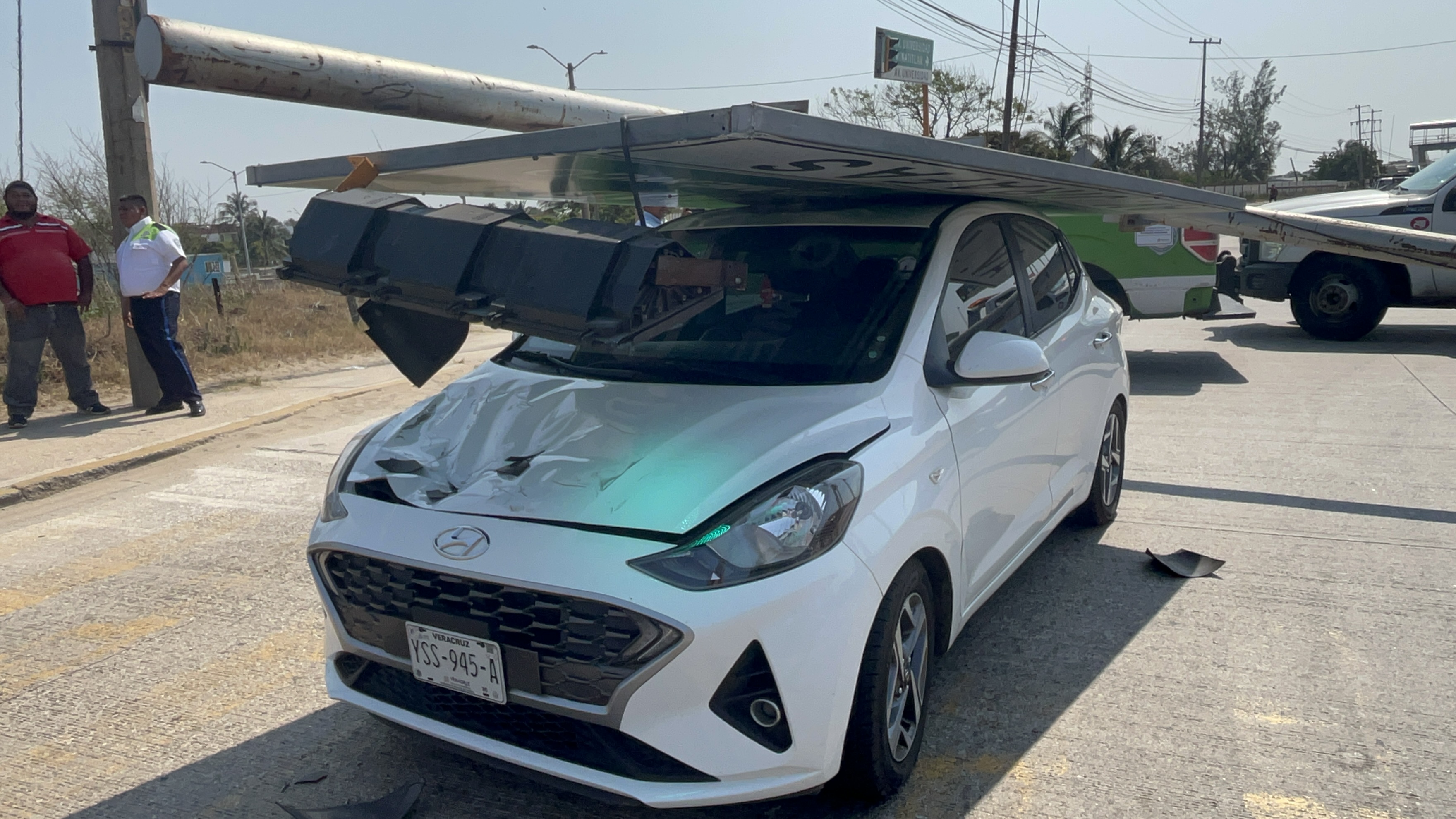 La tarde de este martes un semáforo cayó encima de un automóvil que era conducido por una mujer en la Universidad Veracruzana y Jirafas de la colonia Divina Providencia al poniente de Coatzacoalcos.