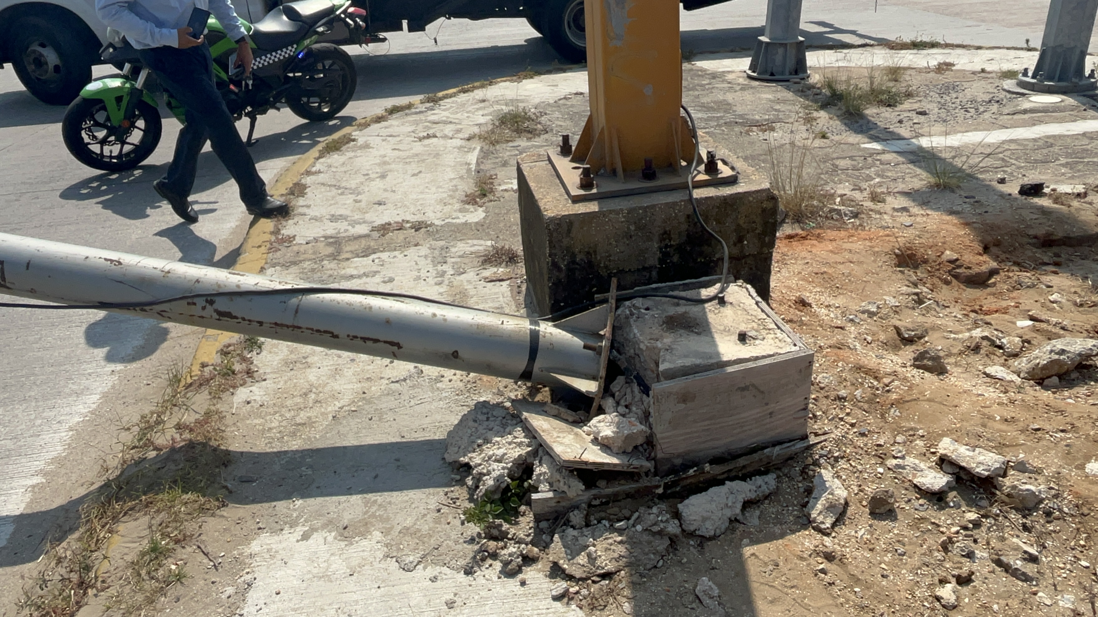 El semáforo se desprendió de su base por las pésimas condiciones en las que se encontraba, aunado a la surada que se está sintiendo.
