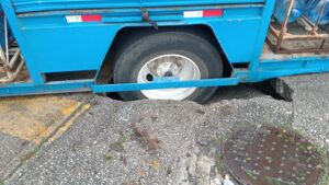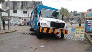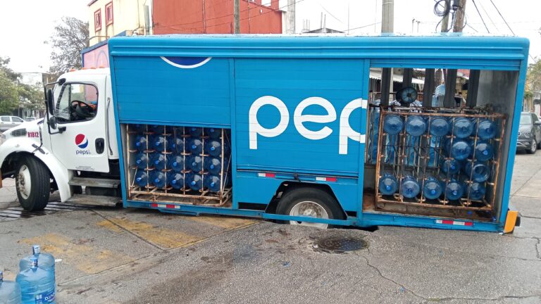 Atrapada quedó una de las llantas de un camión de conocida empresa refresquera, después de que se formara un socavón en la colonia Esfuerzo de los Hermanos del Trabajo, en Coatzacoalcos.