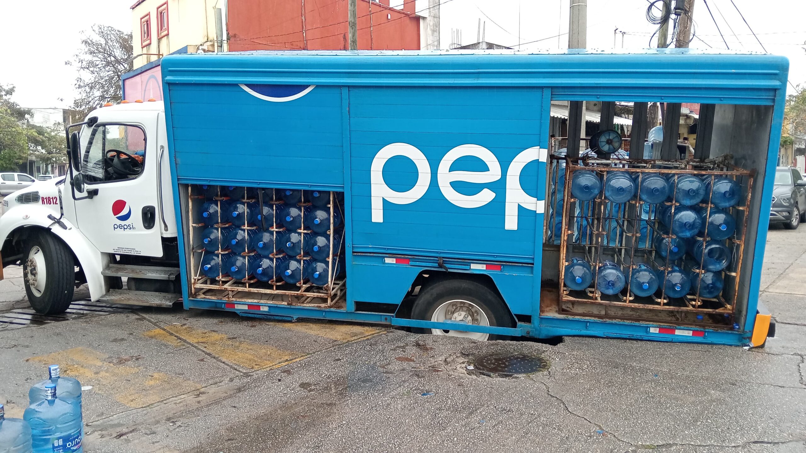 El socavón provocó que una de las ruedas del camión que transportaba garrafones de agua, quedará atorada en este profundo hueco, sin que le permitiria avanzar su camino.