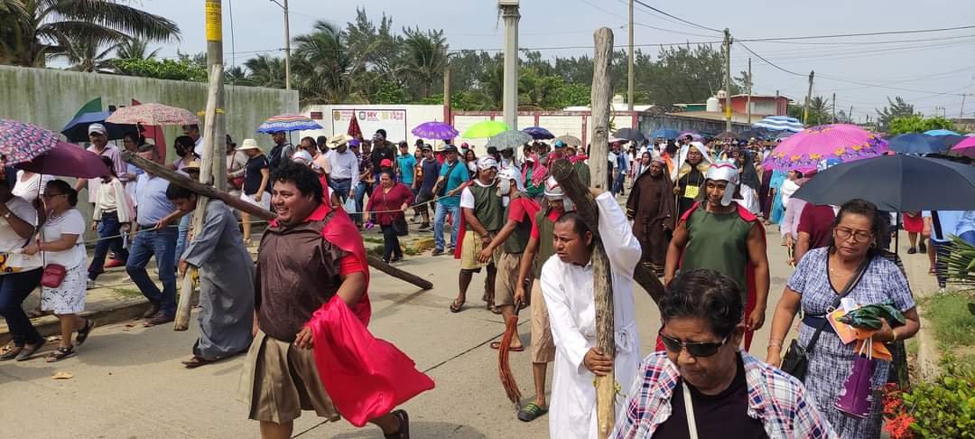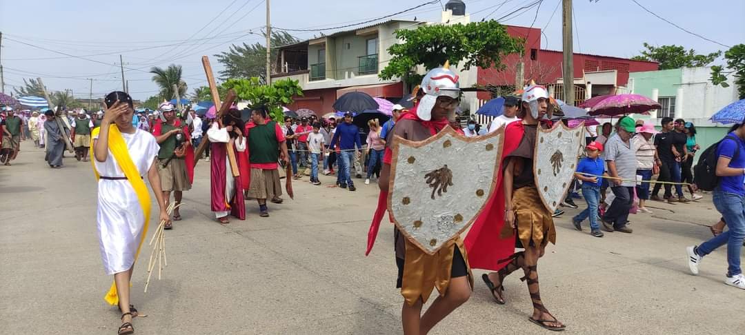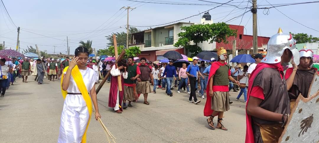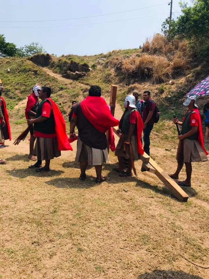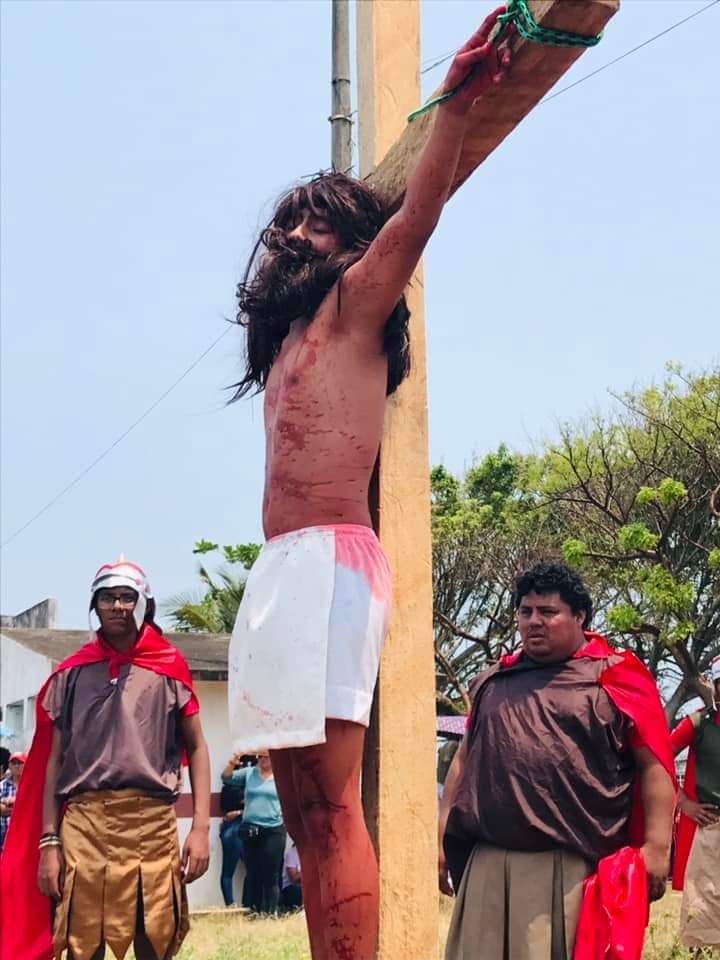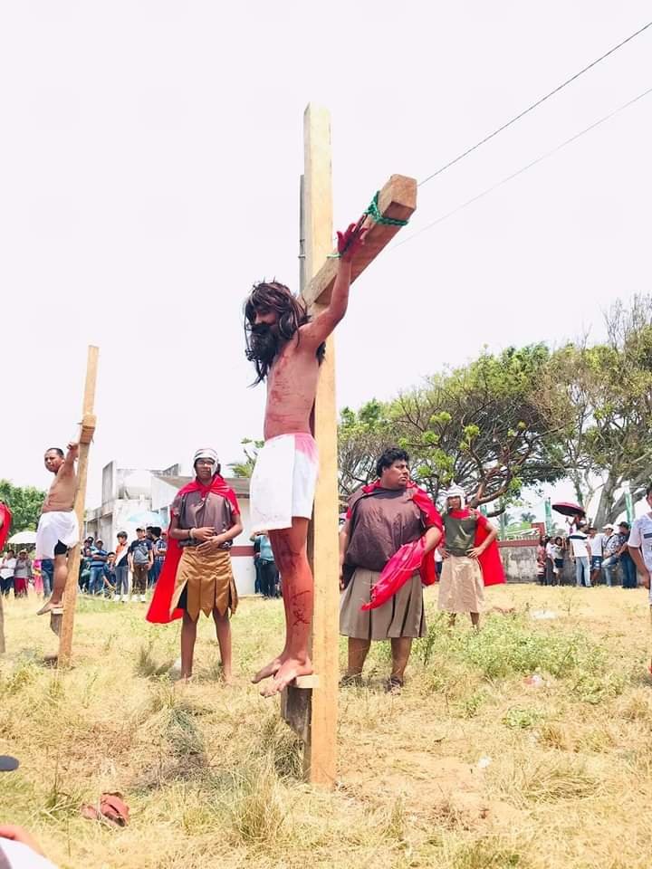 Posteriormente en punto de las 9:00 horas inició el recorrido por las calles: Zamora, López Presenda, 5 de Mayo, Juan Osorio López y Zamora hasta llegar al campo deportivo “El Faro” donde se realizó la crucifixión de Jesús.