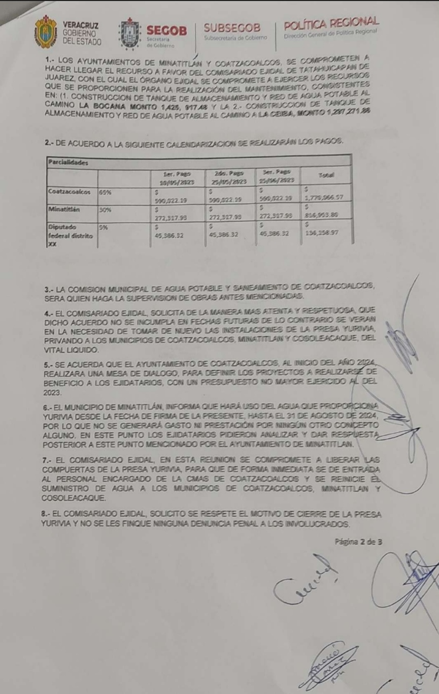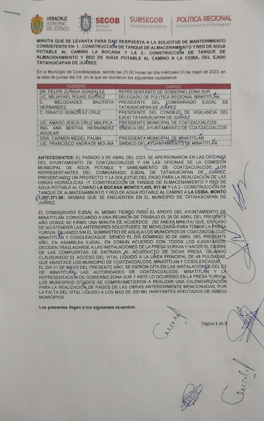 El municipio de Minatitlán hará uso del agua que proporciona el Yurivia desde la fecha de la firma de la minuta hasta el próximo 31 de agosto de 2024.