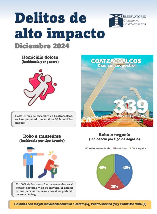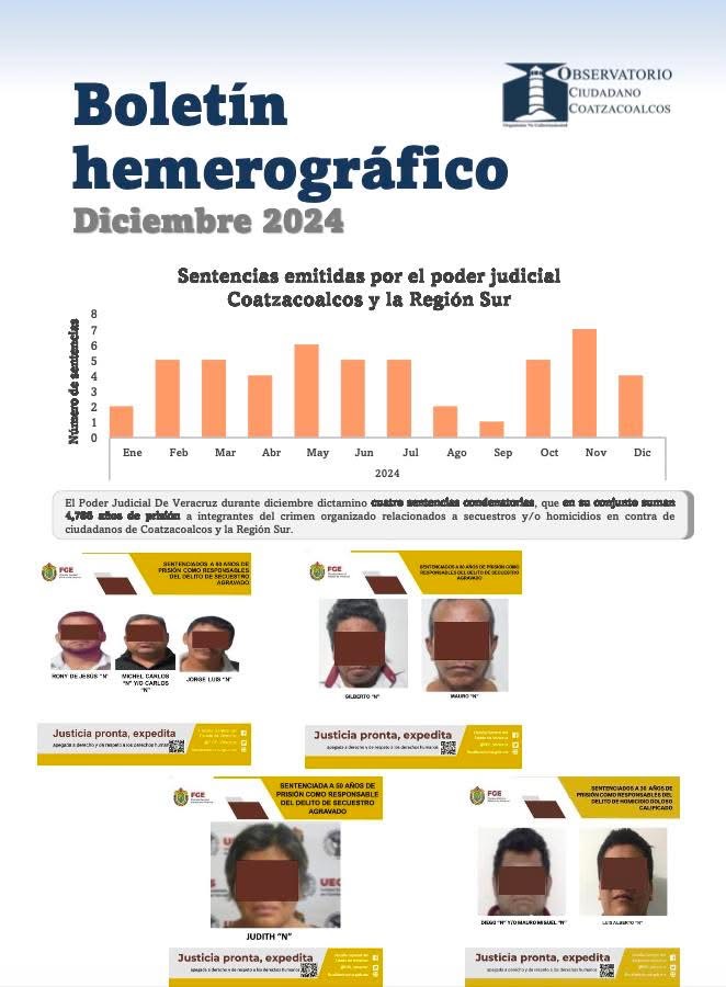 Coatzacoalcos cerró diciembre de 2024 como el municipio con mayor incidencia delictiva en la región sur de Veracruz, reportó el boletín hemerográfico del Observatorio Ciudadano.