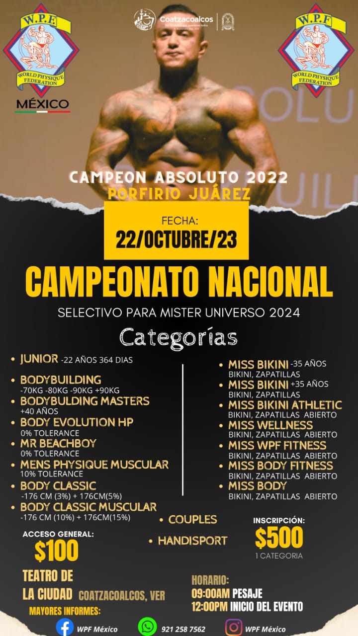 Coatzacoalcos será sede de uno de los eventos más relevantes del año en el fisicoculturismo mexicano, el “Campeonato Nacional” selectivo para “Míster Universo 2024” organizado por la WPF.