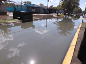 El origen del problema se localiza en un pozo de visita que, según los afectados, funciona “como fuente”, brotando de él un caudal constante de aguas negras que inunda la avenida principal.