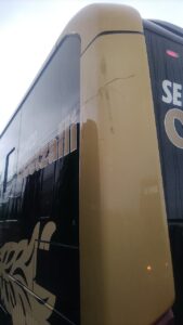 Debido a la falta de precaución al rebasar, la unidad verde impactó por alcance al “Quetzalli, provocando daños en la carrocería en la parte superior y el desprendimiento del retrovisor lateral.