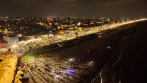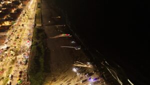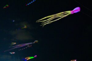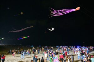 El momento más esperado de la noche es cuando los papalotes se encienden con luces LED, creando un espectáculo visual sin igual que ilumina el cielo nocturno del malecón.