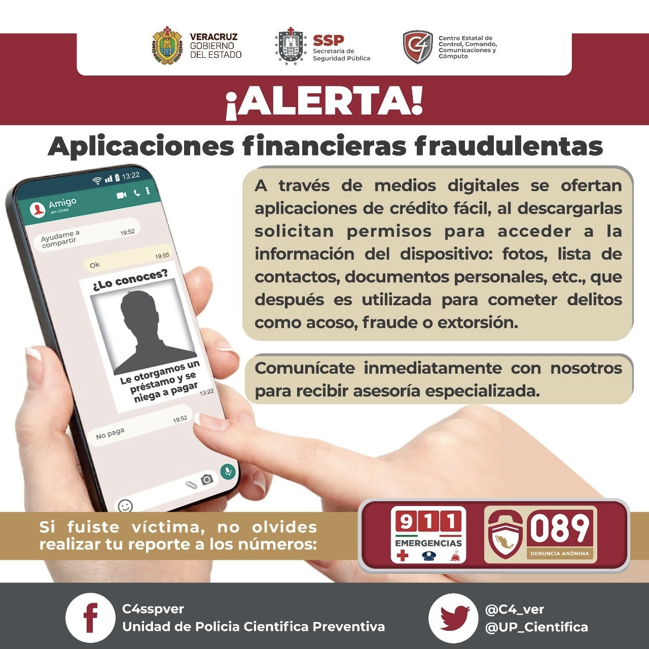 Para evitar ser víctima de los llamados _montadeudas_, la Unidad de Policía Científica Preventiva del Centro Estatal de Control, Comando, Comunicaciones y Cómputo (C4) recomienda no descargar aplicaciones móviles en las que fuentes desconocidas promocionan algún préstamo inmediato.