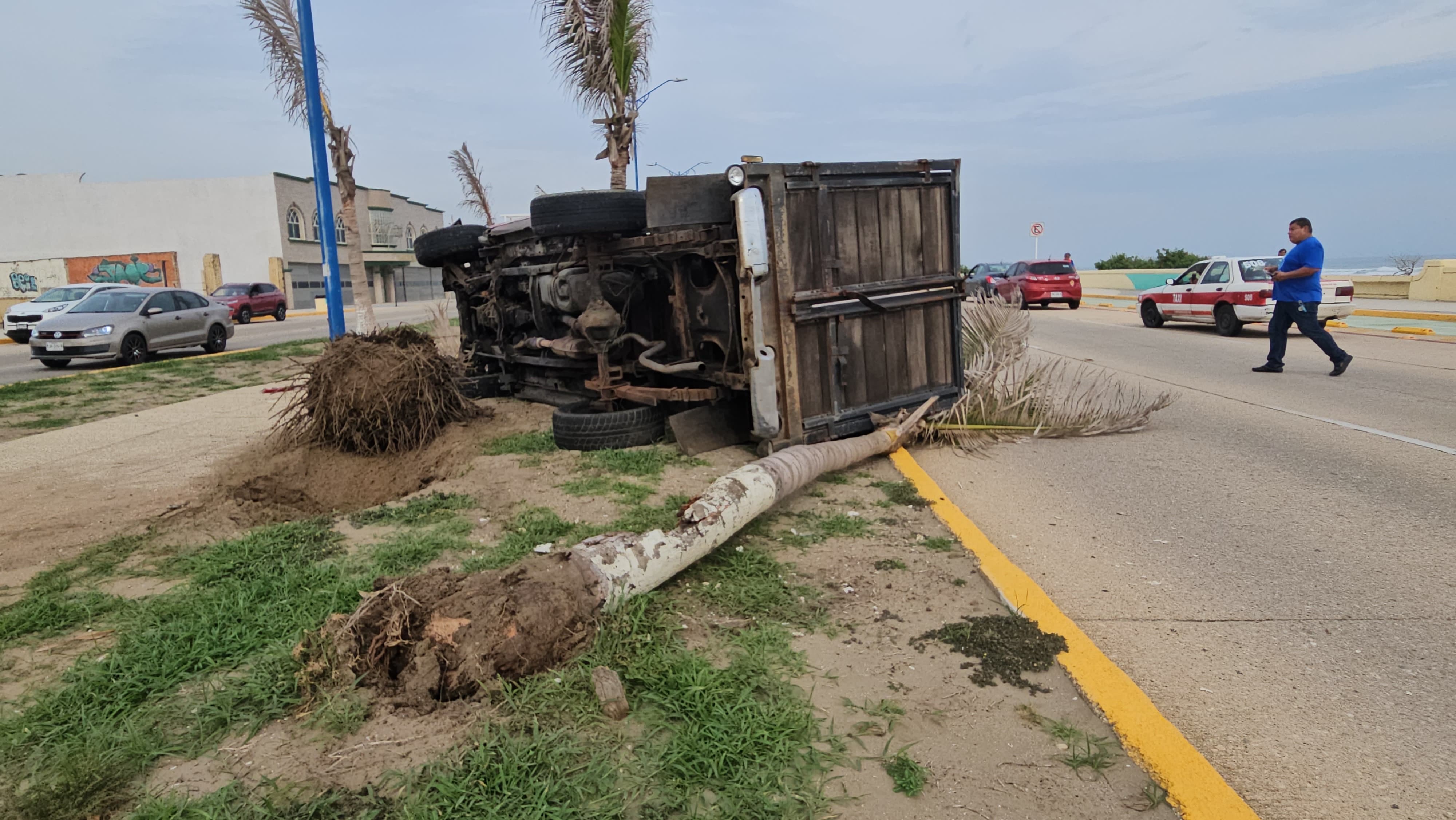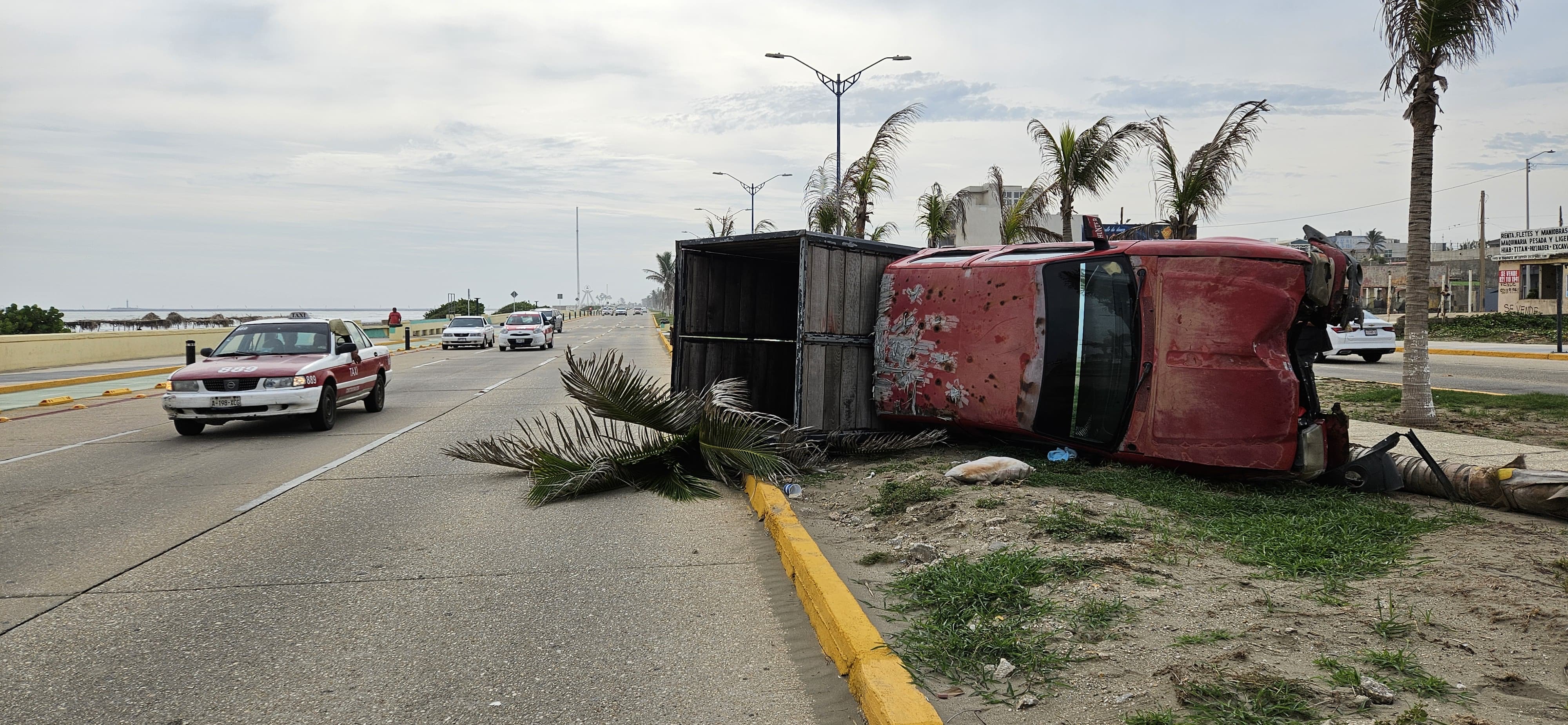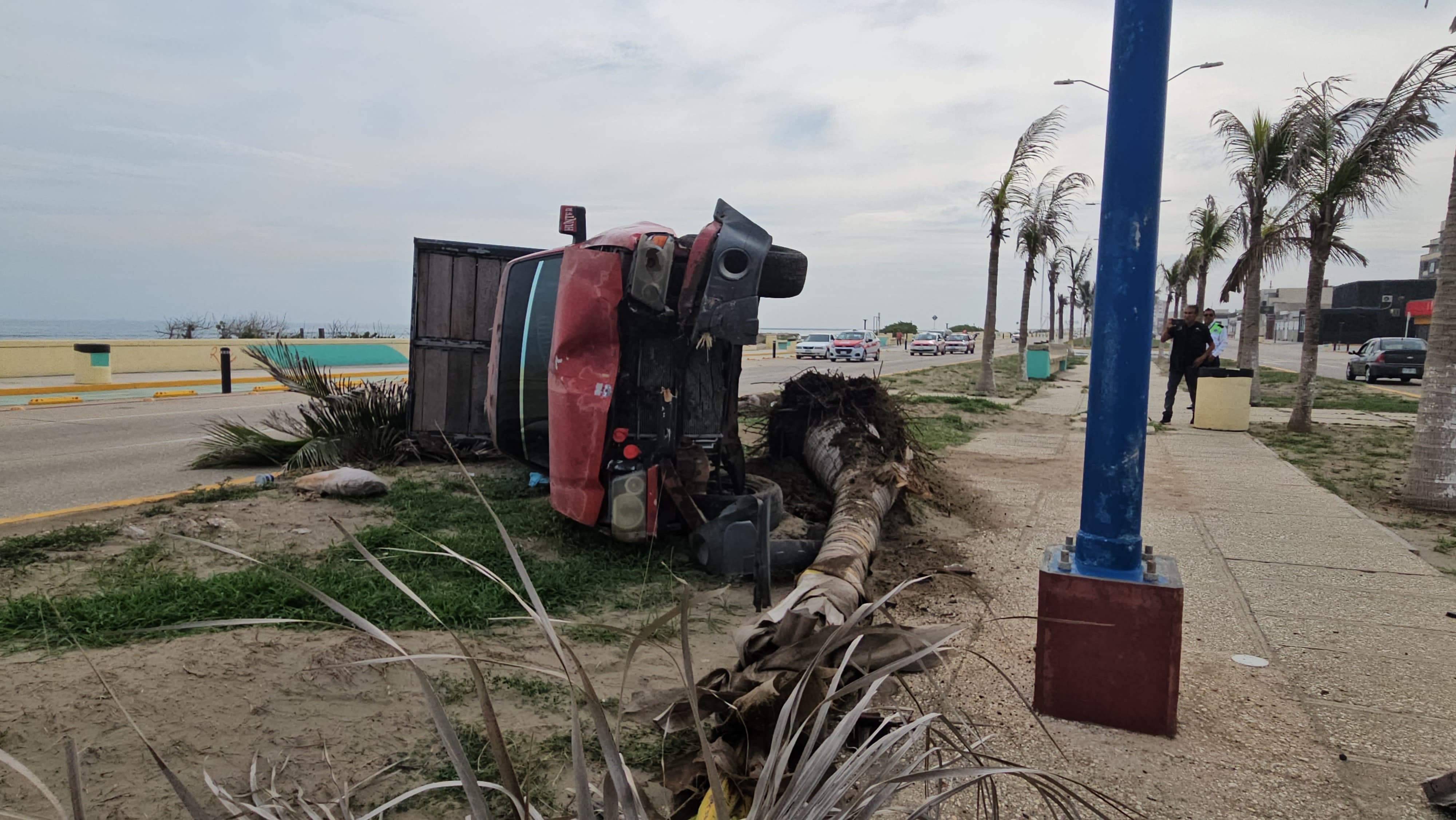 Conductor se impacta contra camioneta y derriba dos palmeras en el malecón de Coatzacoalcos