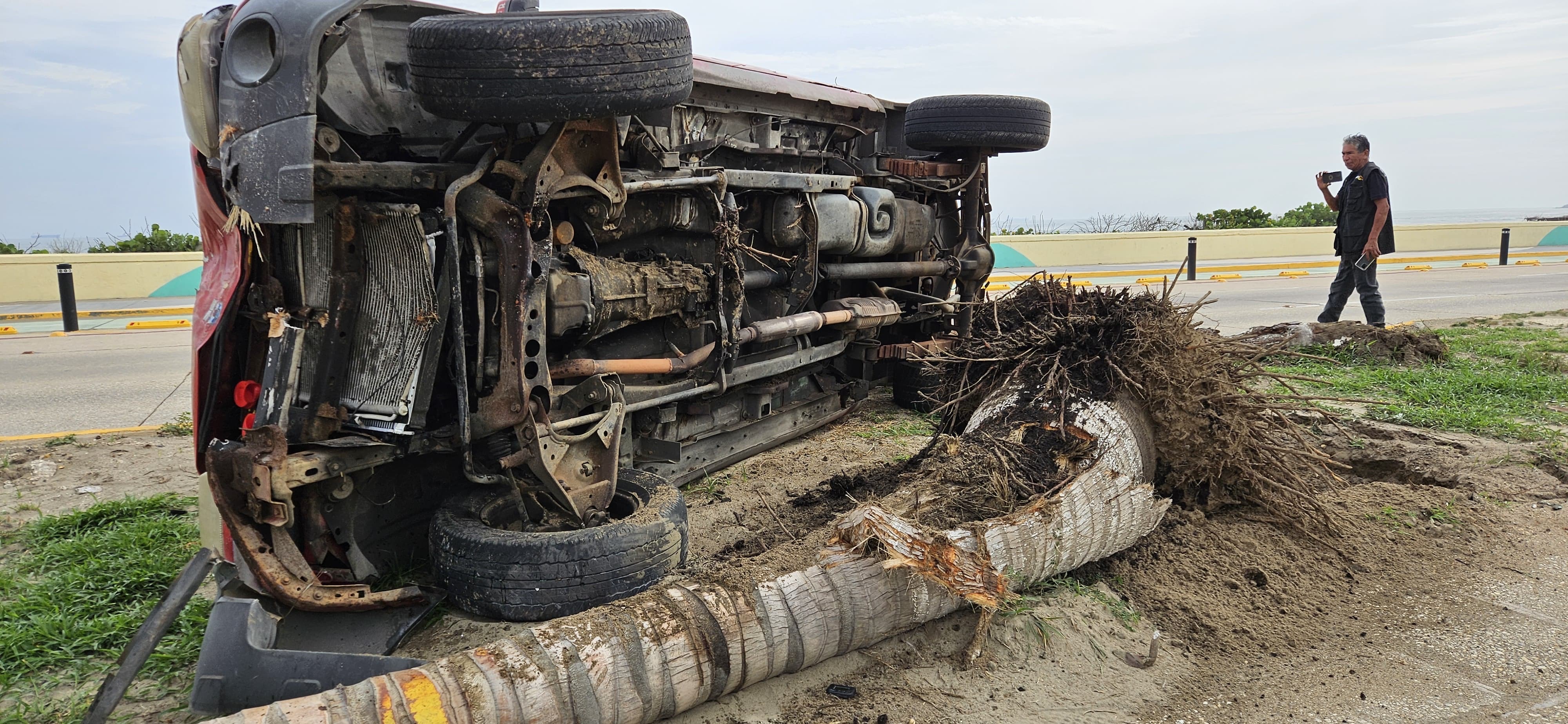 Inicio » Conductor se impacta contra camioneta y derriba dos palmeras en el malecón de Coatzacoalcos