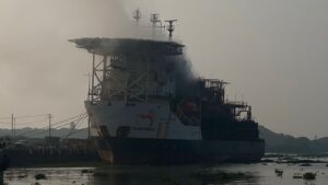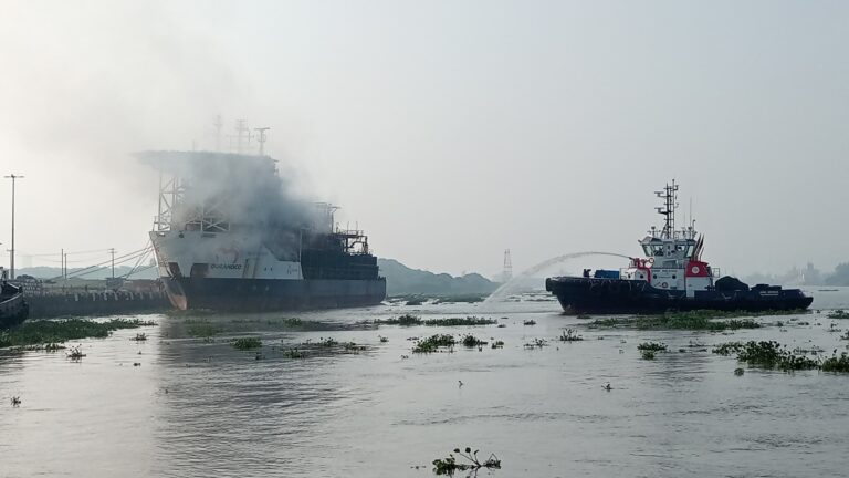 Continúan labores para sofocar incendio en el buque “Blue Phoenix” en el puerto de Coatzacoalcos