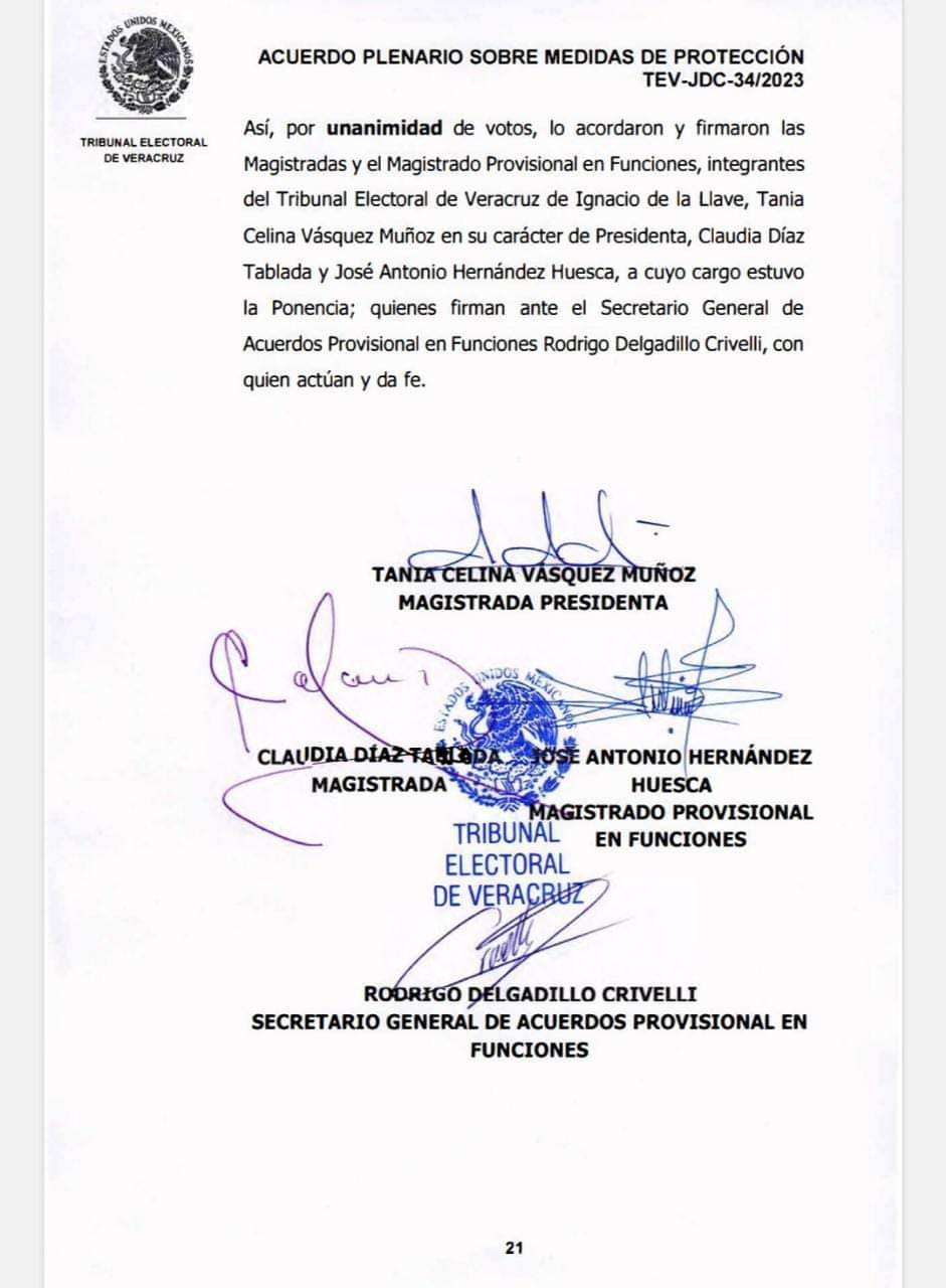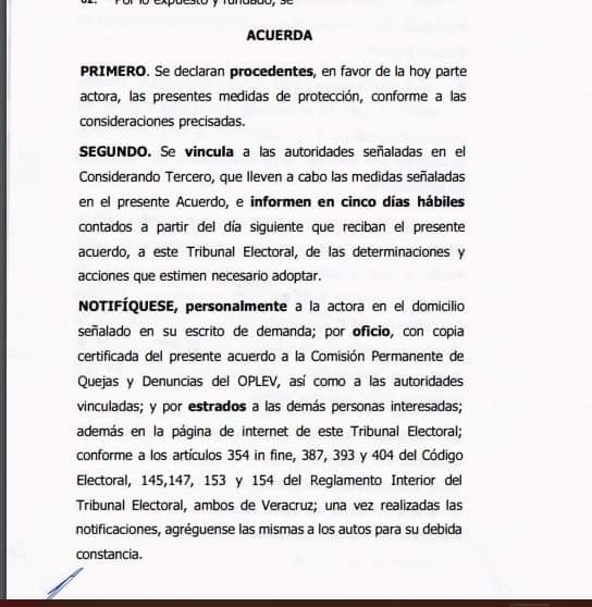 “El Tribunal Electoral resolvió otorgar las medidas de protección asegurando y resguardando la integridad física, emocional, de una servidora. Conmina al Centro de Justicia para las Mujeres y al Instituto Veracruzano de las Mujeres, a conocer y salvaguardar la integridad de una servidora y también al Secretario de Gobierno a no pronunciarse ya, ni a sus subordinados, en tanto se resuelva el fondo”, añadió la diputada.