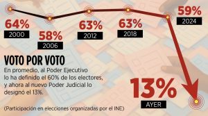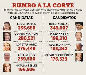 Es decir con 13 millones de votantes, fueron electos nueve ministros de la Corte, los integrantes del Tribunal de Disciplina Judicial, magistrados electorales federales y diversos jueces de distrito y de Tribunales estatales, un total de 2 mil 681 cargos federales y locales.