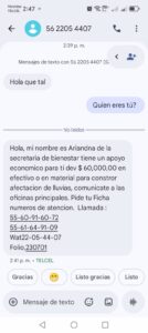 Asimismo, se reportó el envío de mensajes SMS fraudulentos a nombre de la secretaria de Bienestar  Ariadna Montiel.