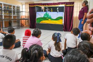 En esta ocasión, el personal de la biblioteca que se ubica en la colonia Adolfo López Mateos cargó con el gigante teatro guiñol y los títeres y los instaló en la escuela para deleitar a los niños y niñas con el cuento ‘El Mago de Oz’.