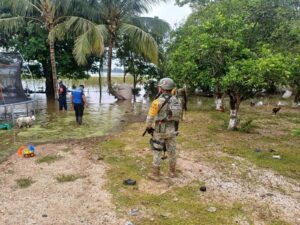 Además, las fuerzas castrenses mantienen patrullajes preventivos en diversas localidades del municipio, con el objetivo de detectar posibles daños a viviendas y brindar atención inmediata a familias damnificadas.