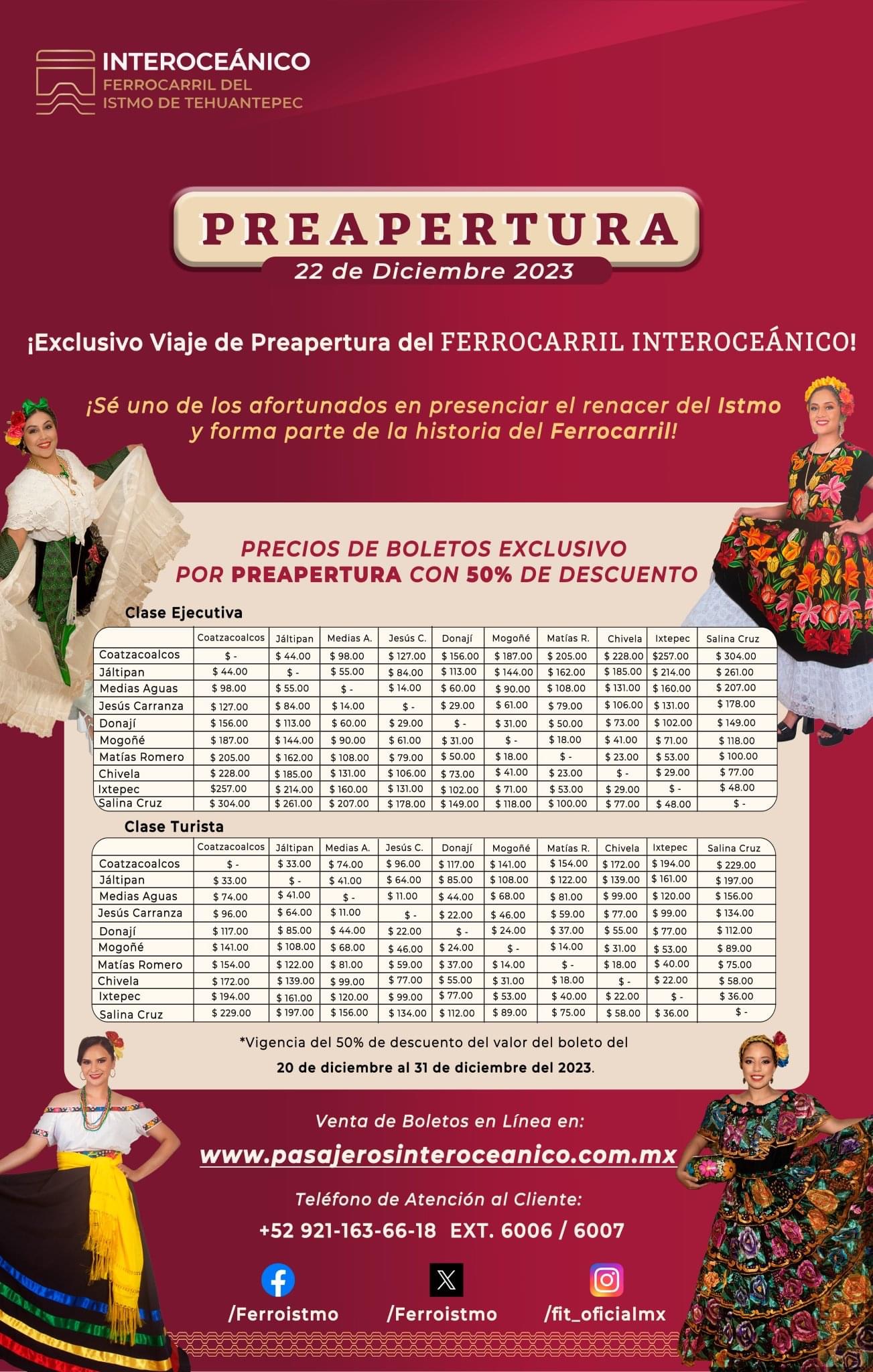 Como parte de la promoción de preapertura, los boletos tienen un descuento del 50 por ciento para un viaje de Coatzacoalcos a Salinas Cruz, el costo en clase Ejecutiva es de 304 pesos, mientras que en clase Turista es de 229 pesos.