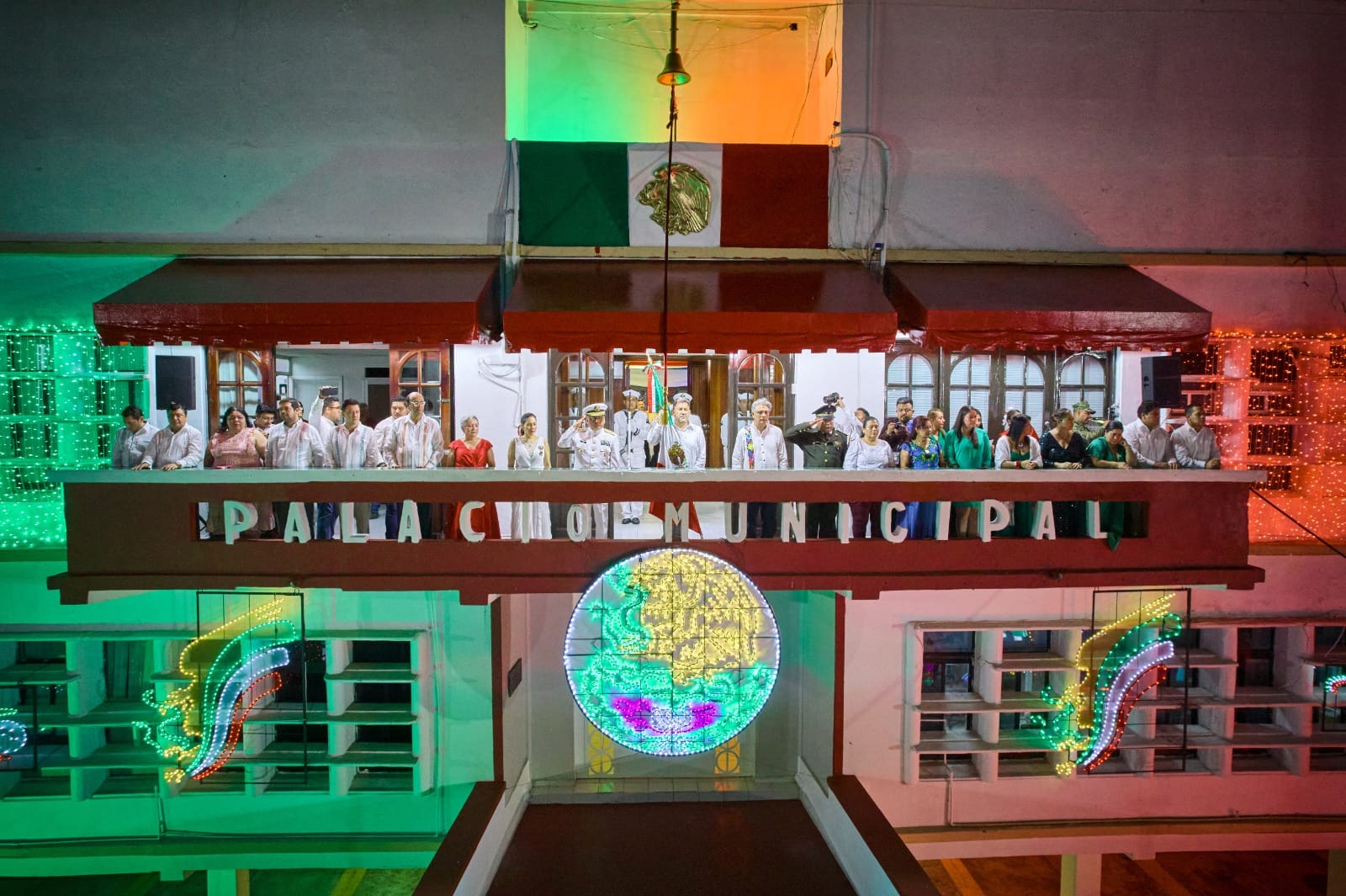 La Síndico Único, Ana Bertha Hernández Aguilar, entregó solemnemente el lábaro patrio a la escolta de la Séptima Zona Naval como parte del acto cívico. Posteriormente, el Presidente izó la bandera nacional y tocó la campana para entonar el tradicional grito de independencia, rindiendo homenaje a los héroes de la patria.