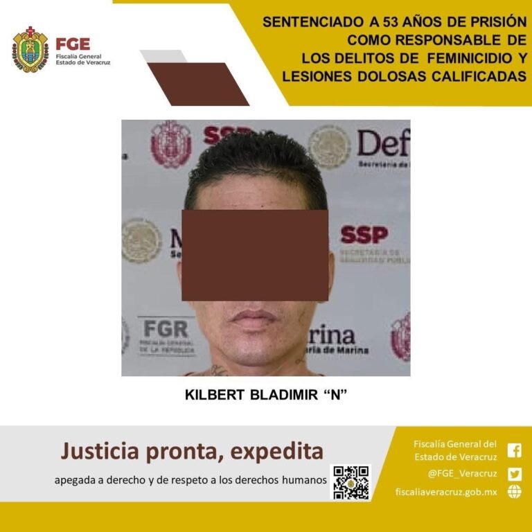 La Fiscalía General del Estado, a través de la Fiscalía Regional Coatzacoalcos, obtuvo de un juez una sentencia condenatoria de 53 años de prisión en contra de Kilbert Bladimir “N”, como responsable de los delitos de feminicidio y lesiones dolosas calificadas, cometidos en agravio de dos víctimas cuyas identidades se encuentran legalmente resguardadas.