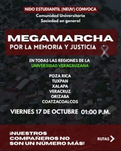 La concentración será el viernes 17 de octubre a las 13:00 horas en las regiones universitarias del estado: Coatzacoalcos, Xalapa, Veracruz, y Orizaba.