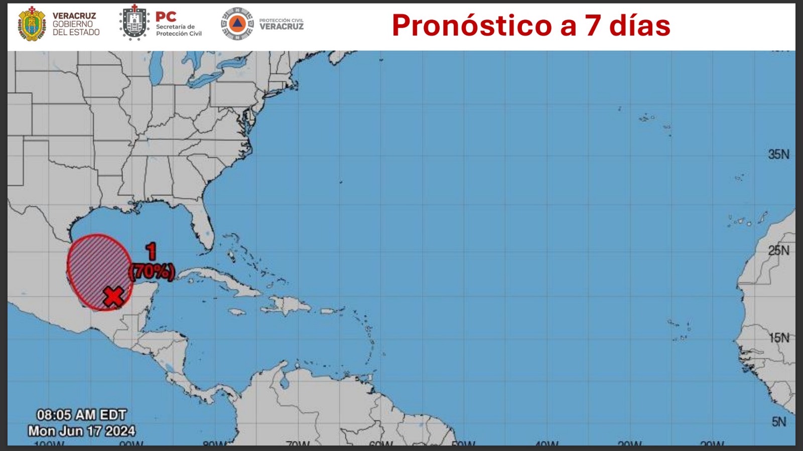 En conferencia de prensa, resaltó que de acuerdo a la última actualización, el fenómeno podría impactar en los municipios de Pánuco y Pueblo Viejo, pero traería lluvias importantes a todo el estado. “No es tormenta tropical todavía, no está catalogada así, es un disturbio tropical, pero trae lluvia puntual”.