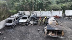 Así se observa el resultado de una explosión en la ranchería Buena Vista Río Viejo primera sección del municipio de Centro, que dejó como saldo preliminar 14 vehículos con daños y dos personas con lesiones y golpes menores. Se puede ver a las unidades totalmente calcinadas.