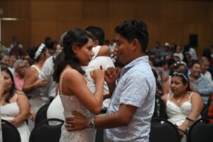 Las parejas, vestidas de blanco, recibieron sus actas matrimoniales sin costo alguno y celebraron con música en vivo, el tradicional vals, la partida del pastel y una rifa de regalos. Familiares y amigos acompañaron la ceremonia, que se desarrolló en un ambiente festivo y de unidad.