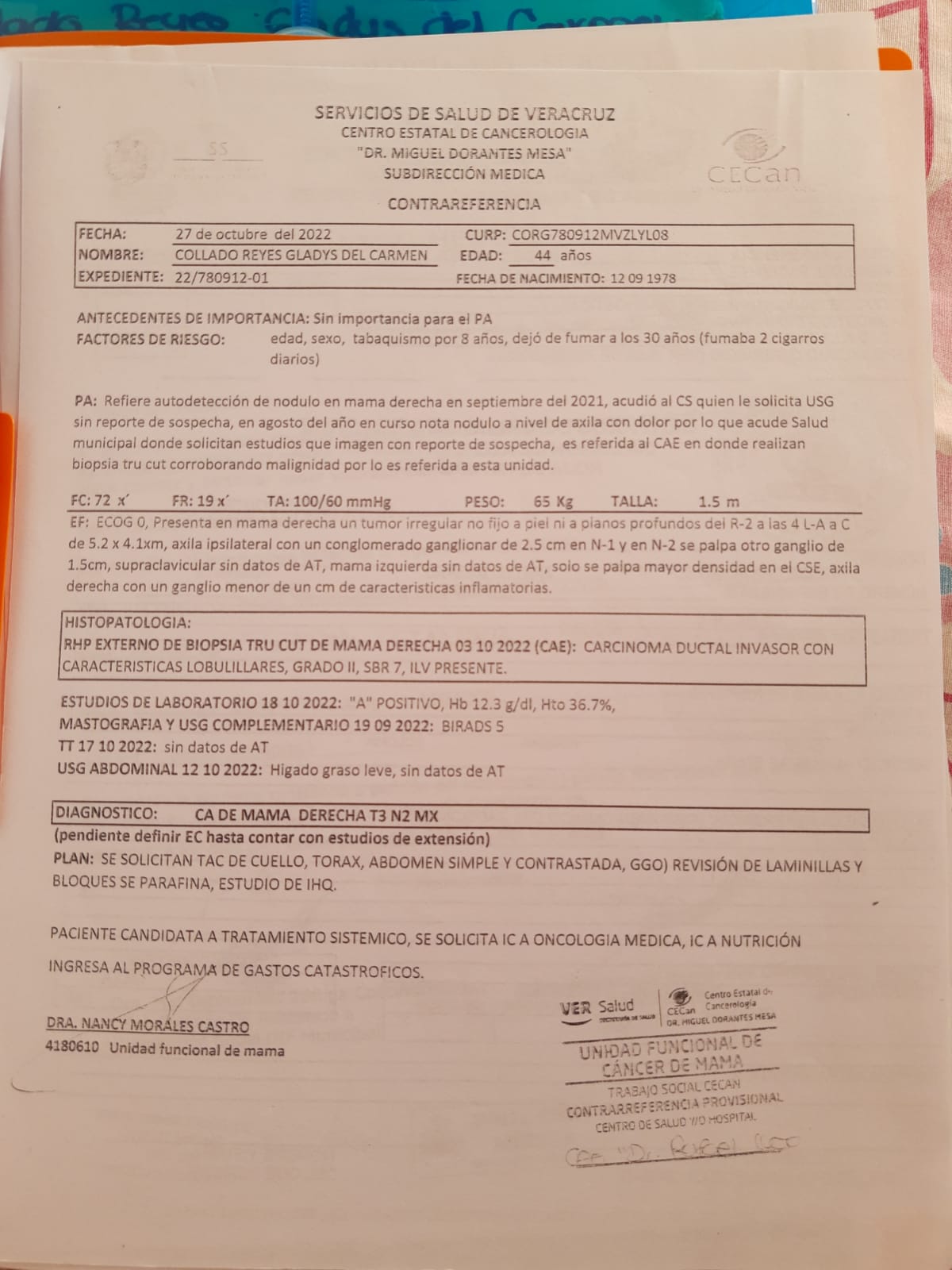 En octubre de 2022 luego de un largo y doloroso peregrinar, el Centro Estatal de Cancerología de la Secretaría de Salud en Veracruz le dio el resultado de la biopsia: cáncer de mama derecha T3.