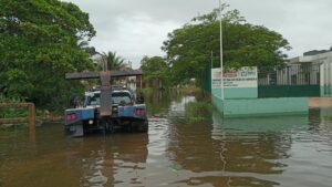 Según los reportes de testigos, el percance ocurrió mientras el operador realizaba una maniobra. La gran cantidad de agua que cubría la calle borró el límite entre el pavimento y el canal, provocando que la pesada unidad cayera.
