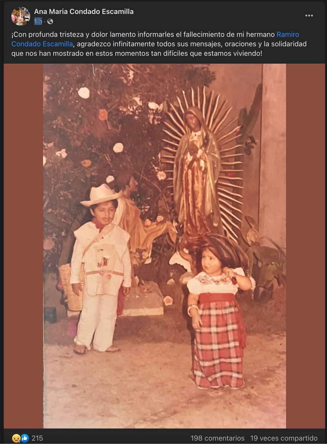 “¡Con profunda tristeza y dolor lamento informarles el fallecimiento de mi hermano Ramiro Condado Escamilla, agradezco infinitamente todos sus mensajes, oraciones y la solidaridad que nos han mostrado en estos momentos tan difíciles que estamos viviendo!”, publicó, aunque no especificó la manera en que falleció ni las circunstancias.