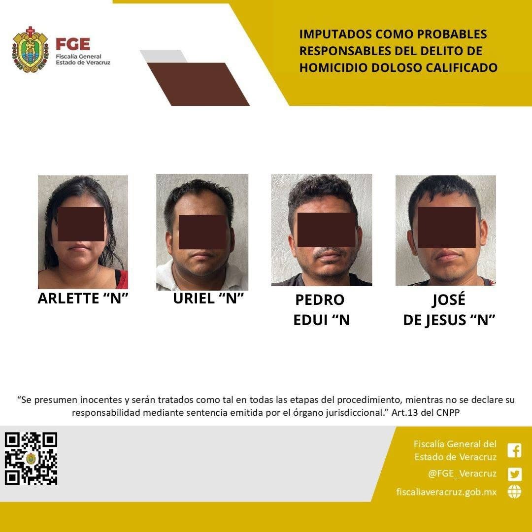 La Fiscalía General del Estado informa que, la Fiscalía Regional Coatzacoalcos realizó imputación en contra de José de Jesús “N”, Uriel “N”, Arlette “N” y Pedro Edui “N” como probables responsables del delito de homicidio doloso calificado cometido en agravio de la víctima A.C.G.