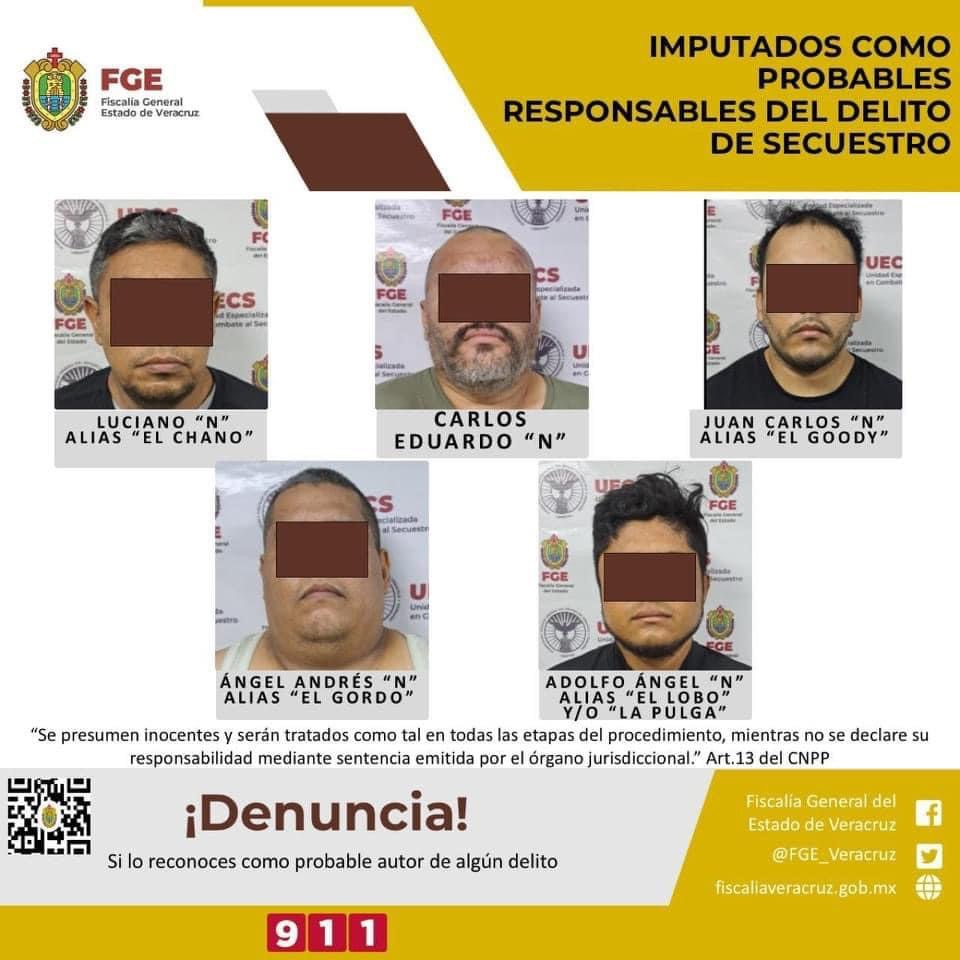 La Fiscalía General del Estado informa que, a través de la Unidad Especializada en Combate al Secuestro, realizó imputación en contra de Juan Carlos “N” alias “El Goody”, Luciano “N” alias “El Chano”, Adolfo Ángel “N” alias “El Lobo” y/o “La Pulga”, Ángel Andrés “N” alias “El Gordo” y Carlos Eduardo “N” como probables responsables del delito de secuestro en agravio de siete personas y una menor de edad, de origen Venezolano, Hondureño y Colombiano, así como de la víctima J.L.B.C.