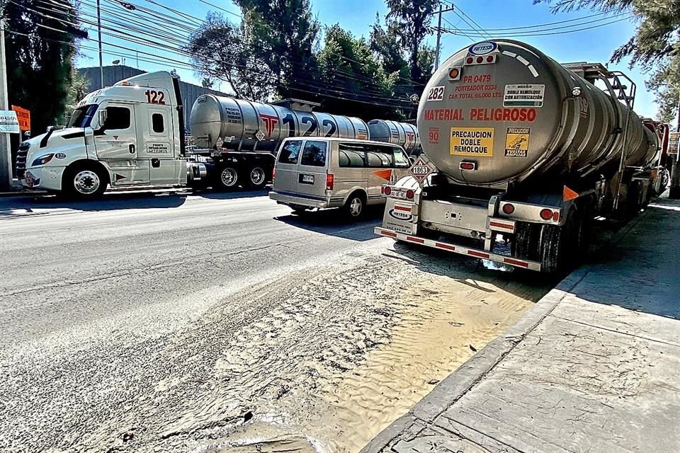 Pese al riesgo que representan, pipas de doble remolque que transportan turbosina al Aeropuerto Internacional de la Ciudad de México (AICM) son estacionadas en avenidas debido a la saturación del almacenaje de combustibles de Aeropuertos y Servicios Auxiliares (ASA).