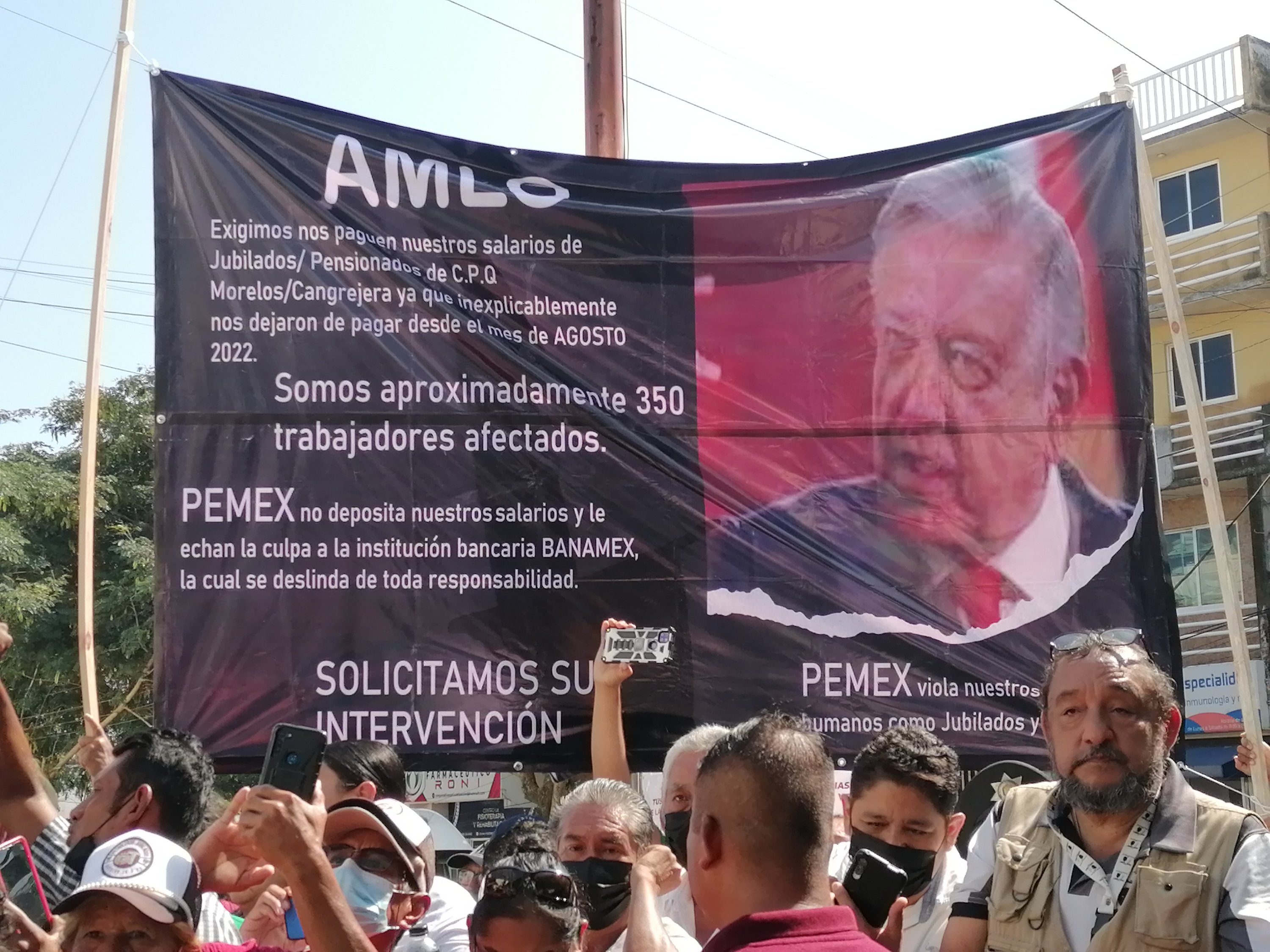 En una lona dirigida al presidente Andrés Manuel López Obrador, que colocaron enfrente del hospital “Dr. Valentín Gómez Farías”, se lee: “Exigimos nos paguen nuestros salarios de jubilados/pensionados del complejo petroquímico Morelos y Cangrejera ya que inexplicablemente nos dejaron de pagar desde el mes de agosto de 2022”, indica el texto.