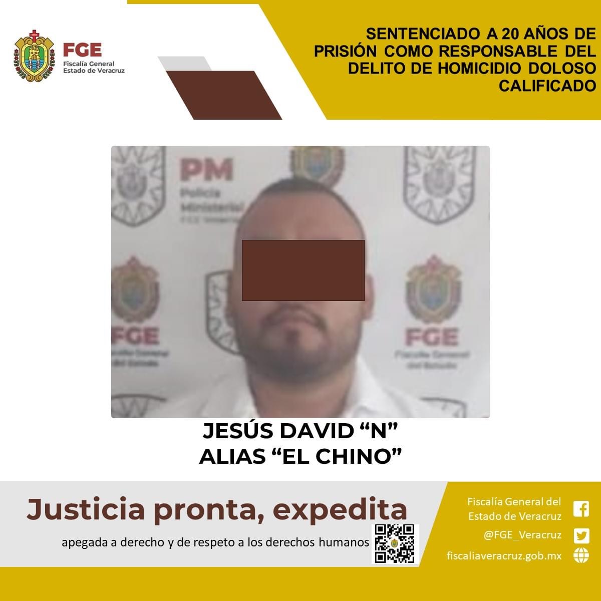 La Fiscalía Regional Cosamaloapan logró sentencia condenatoria de 20 años de prisión en contra de Jesús David “N” alias “El Chino” como responsable del delito de homicidio doloso calificado en agravio de la víctima identificada con las iniciales J.S.S.